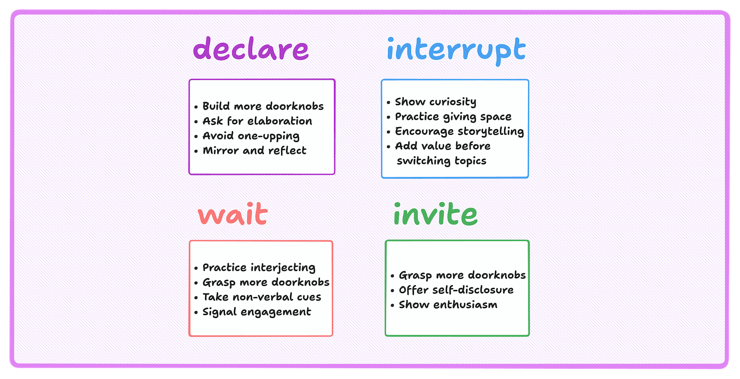 Grasp more doorknobs: Catch yourself thinking "I'll wait my turn" → Look for conversational affordances like digressions or bold claims to join in