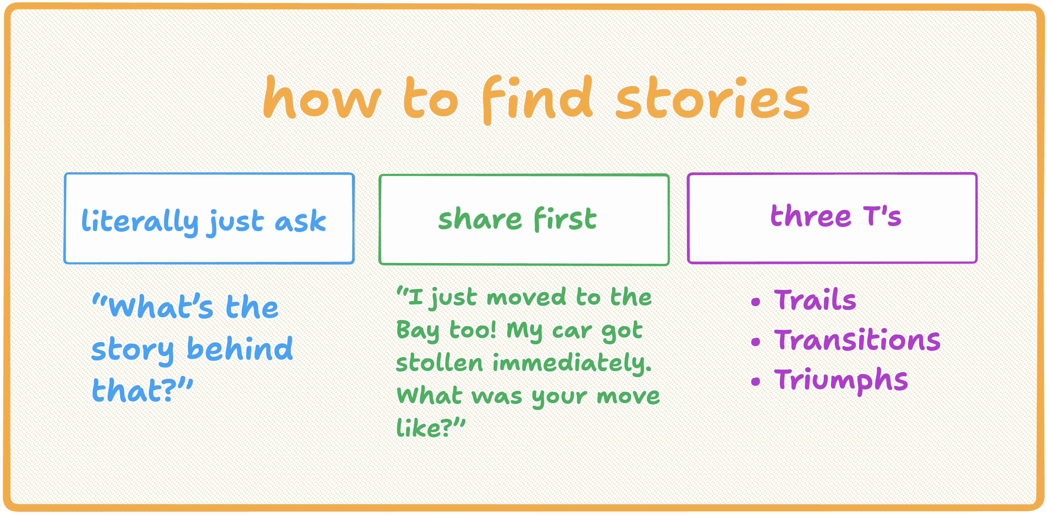 This is a framework adapted from Rian Meghji’s Every Conversation Counts. Look for trails, transitions, and triumphs and ask them to elaborate: