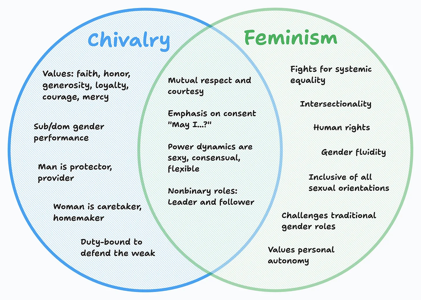 The chivalrous person acts with assertiveness and grace. The action is not about dominance, it’s about care and connection. The full analysis is here: